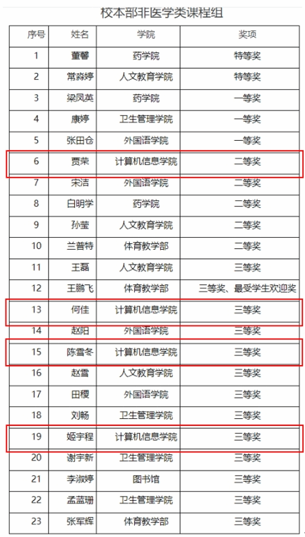 2024年5月28日,根据《关于对内蒙古医科大学第十二届青年教师课堂教学技能比赛获奖结果的公示》(内医教工发),我院四名教师在校本部非医学类课程组获奖,其中