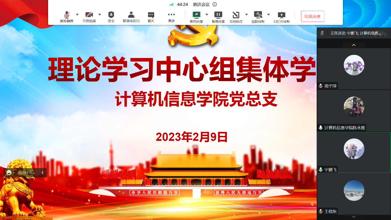 2月8日-9日,计算机信息学院党总支理论学习中心组围绕2022年度民主生活会主题开展集体学习研讨。理论学习中心组全体成员参加,会议由党总支副书记、副院长陈永胜同志主持。