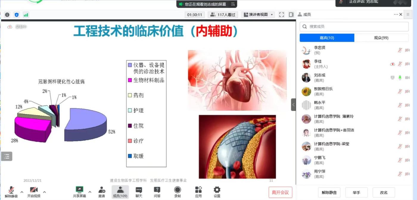 2022年12月21日,计算机信息学院邀请首都医科大学生物医学工程学院前院长刘志成教授以线上的形式开展了关于《学科交叉与融合是专业建设与发展的必由之路--以生物医学工程为例》的主题讲座。本次讲座由生物医学工程教研室主任李忠贤教授主持,计算机信息学院师生及其他学院教师聆听了刘志成教授的报告。