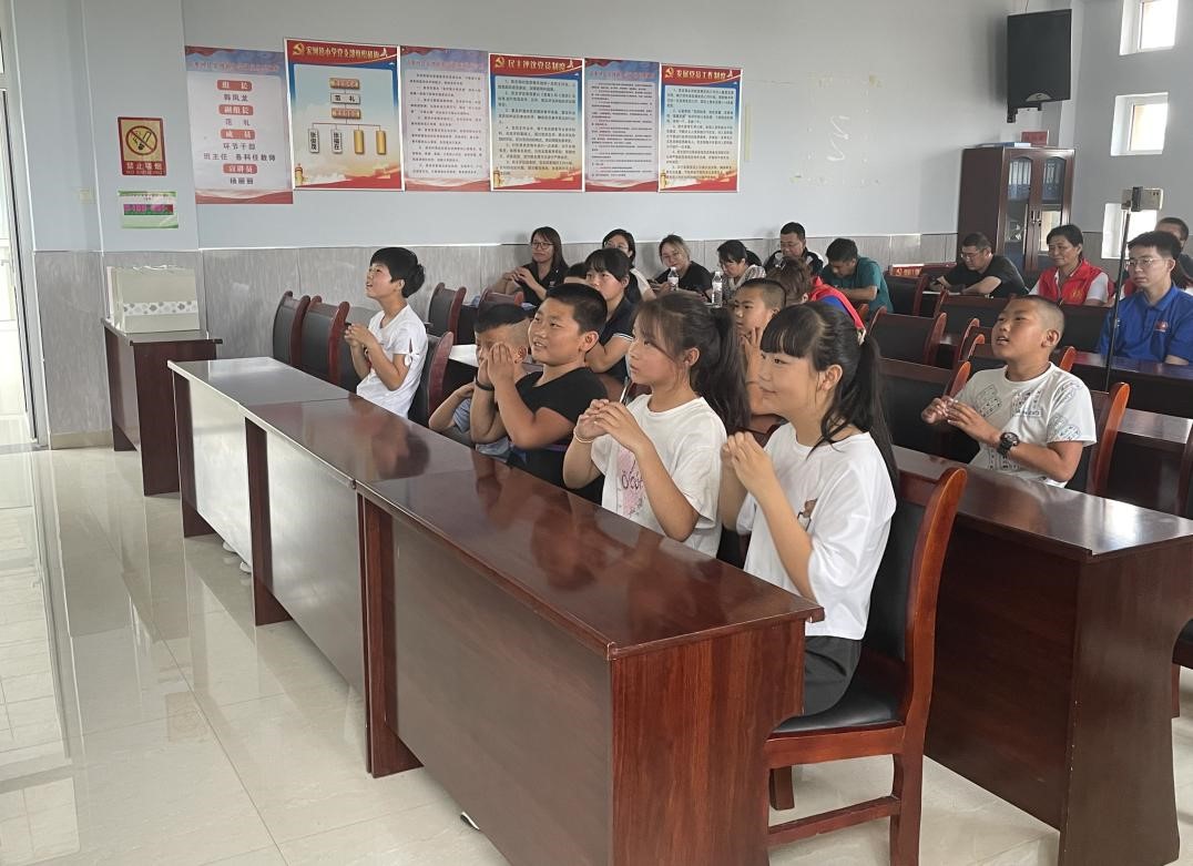 实践队将做好国家通用语言文字普及提升工程和实施推普助力乡村振兴计划作为本次活动的重要工作。19日,实践队为宏河镇小学送去80余册图书及若干体育运动器材。特别是将《写给青少年的党史》系列图书送给了小学读书室,鼓励孩子们积极学习党史,传递爱党爱国爱社会主义的热情。并开展了“童心告白祖国”推普活动,队员教当地小学生学习红色歌曲《童心向党》手势舞,并通过游戏纠正孩子们的普通话发音。
