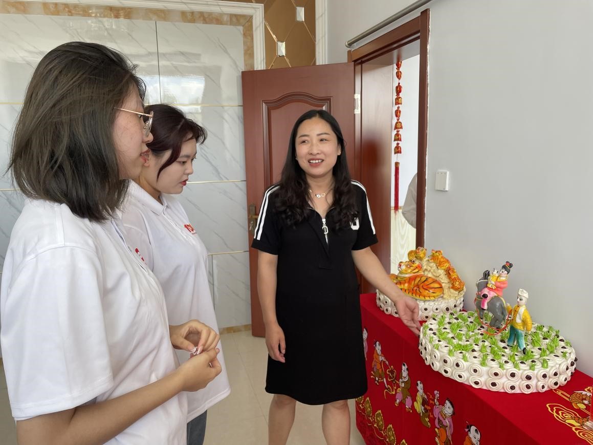 文化振兴是乡村振兴的重要一环,宏河镇依托地域特色,积极挖掘非遗传承人,以非遗项目促进文化振兴。实践队走进内蒙古清水河县陶瓷科技艺术研究所,学习参观了清水河黑陶从“一把土”到“一个壶”的生产过程,采访了非遗传承人牛忠富,了解了清水河制瓷的历史与现状。除瓷艺外,实践队也采访了清水河面塑制作技艺非物质文化遗产传承人贺春梅,参观了优美精巧的面塑作品,并在贺春梅老师的指导下,亲身体验了面塑的制作。安嘉琪是2021级数据科学与大数据技术1班的学生,是第一次参与“三下乡”社会实践活动,她说面塑作品和黑陶作品中包含地方特色文化,还可以为农民增收,结合特色文化发展也是振兴的重要方式。