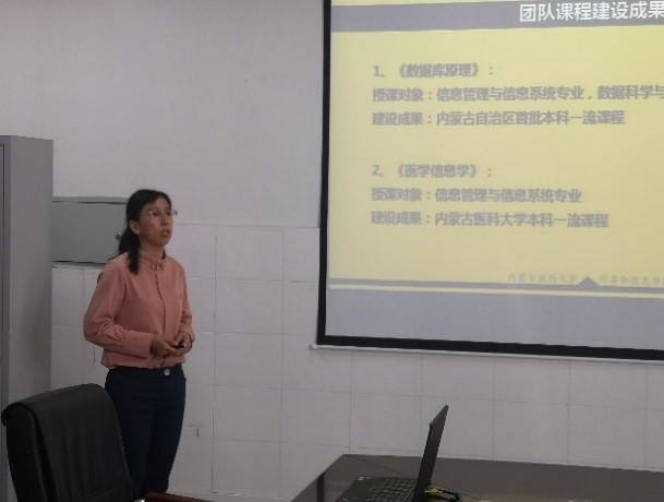 活动由医学信息管理与信息系统教研室赵慧茹老师展示了《软件工程》的课程思政案例教学,物理教研室张磊老师以“转动定律”为例展示了课程思政融入教学的方法,医学多媒体教研室吴雅琴副教授从团队建设、课程建设、教学体会三个方面分享了一流课程建设的教学经验。