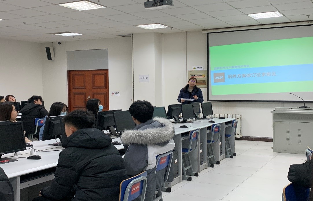 按照学校修订培养方案工作部署安排,为全面深入了解师生对培养方案的意见与建议,在前期召开教师研讨会的基础上,12月26日,在图书馆计算机实验中心实验室二面向本专业所有学生,召开培养方案修订征求意见会。会上,吴雅琴老师对当前培养方案的基本情况向同学们进行了介绍,并就培养方案修订征求了意见和建议。