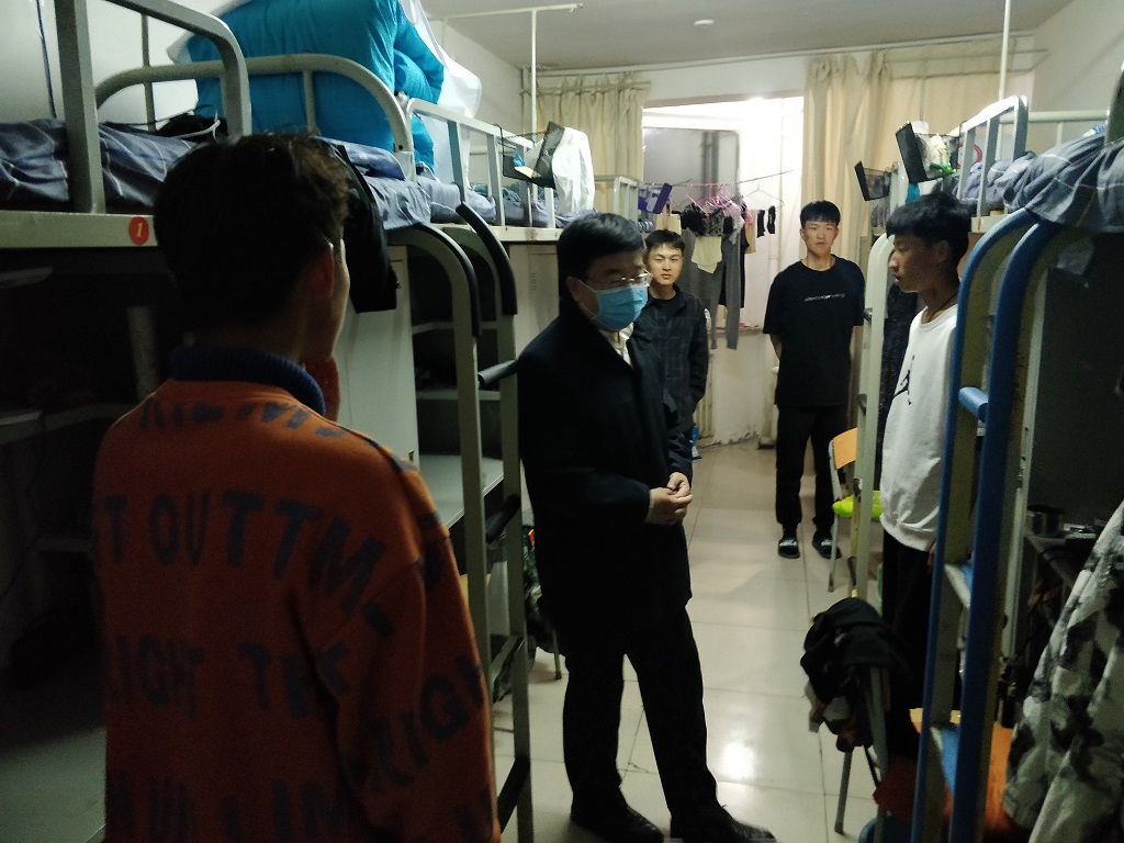 之后王呼生同志对学院及各专业进行了简要介绍并和辅导员、班主任一起走访学生宿舍跟学生们谈心谈话,主要了解学生们的学习、生活、思想动态等,同时向学生们解读了国家统编教材相关政策法规。