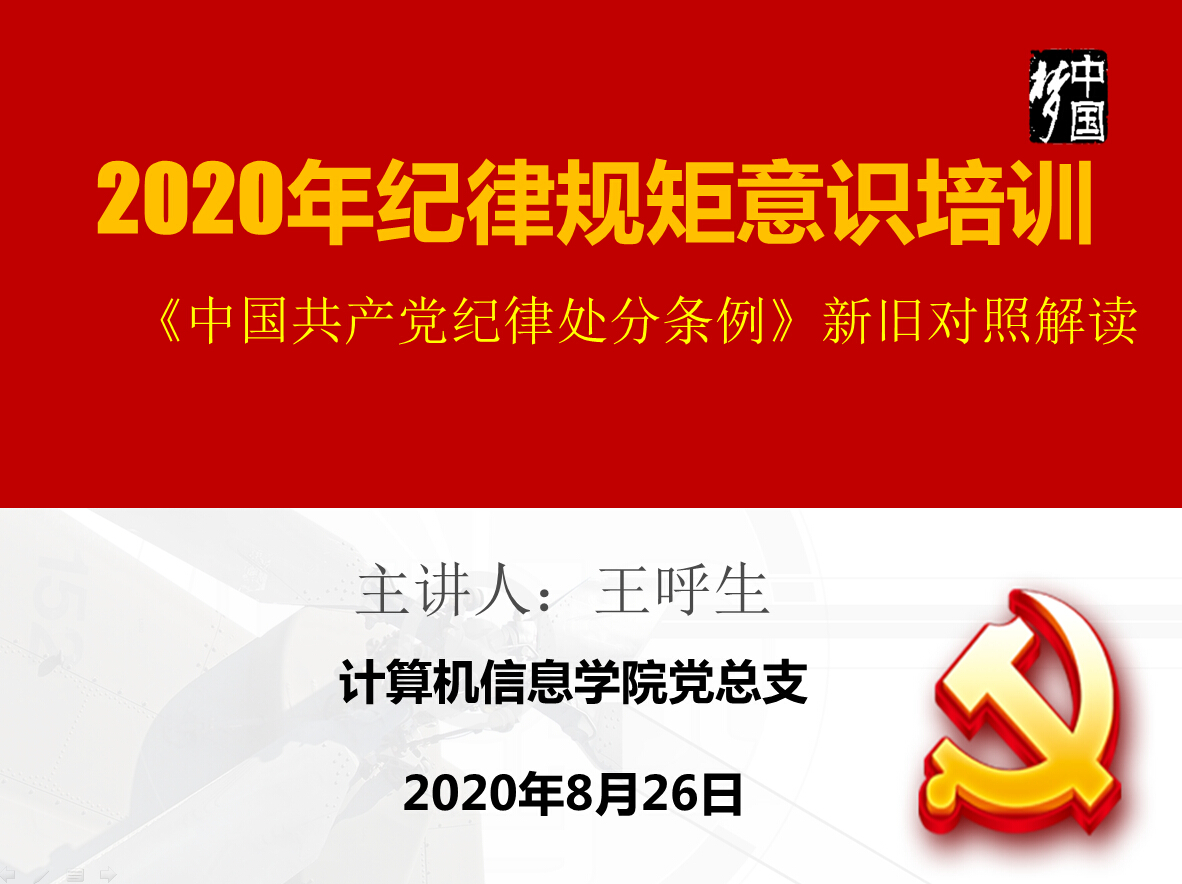 2020年8月26日,计算机信息学院党总支举办纪律规矩意识培训,旨在贯彻落实全面从严治党要求,进一步加强纪律建设,切实把纪律和规矩立起来、严起来。本次培训采用welink线上形式,学院全体党员参加。